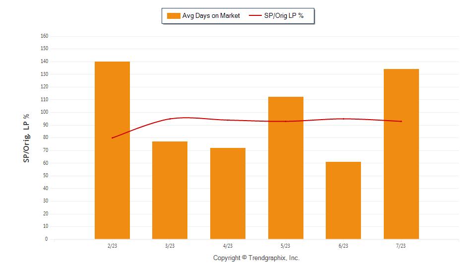 The average Days on Market (DOM) shows how many days the average property is on the market before it sells. An upward trend in DOM trends to indicate a move towards more of a Buyer’s market, a downward trend indicates a move towards more of a Seller’s market. The DOM for July 2023 was 68, up 13.3% from 60 days last month.
