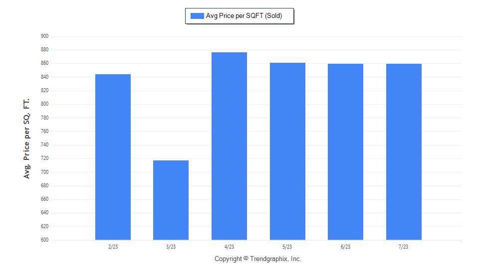 The Average Sold Price per Square Footage is a great indicator for the direction of property values. Since Median Sold Price and Average Sold Price can be impacted by the 'mix' of high or low end properties in the market, the Average Sold Price per Square Footage is a more normalized indicator on the direction of property values. The July 2023 Average Sold Price per Square Footage of $859 was the same as last month.