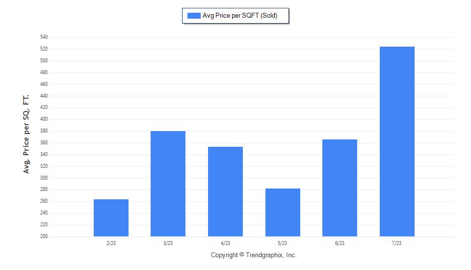 The Average Sold Price per Square Footage is a great indicator for the direction of property values. Since Median Sold Price and Average Sold Price can be impacted by the 'mix' of high or low end properties in the market, the Average Sold Price per Square Footage is a more normalized indicator on the direction of property values. The July 2023 Average Sold Price per Square Footage of $393 was down 8.2% from $428 last month.