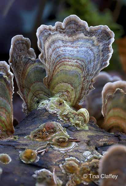 Bracken fern dies back in the chilly temperatures, and turns to a deep ruby red, in many ways at its most beautiful when lit by the evening winter sun, dying in a blaze of glory. Deep in the bog’s wet woodlands, wondrous False Turkey Tail emerges and reveals its layers of glorious colours from fallen waterlogged tree trunks.