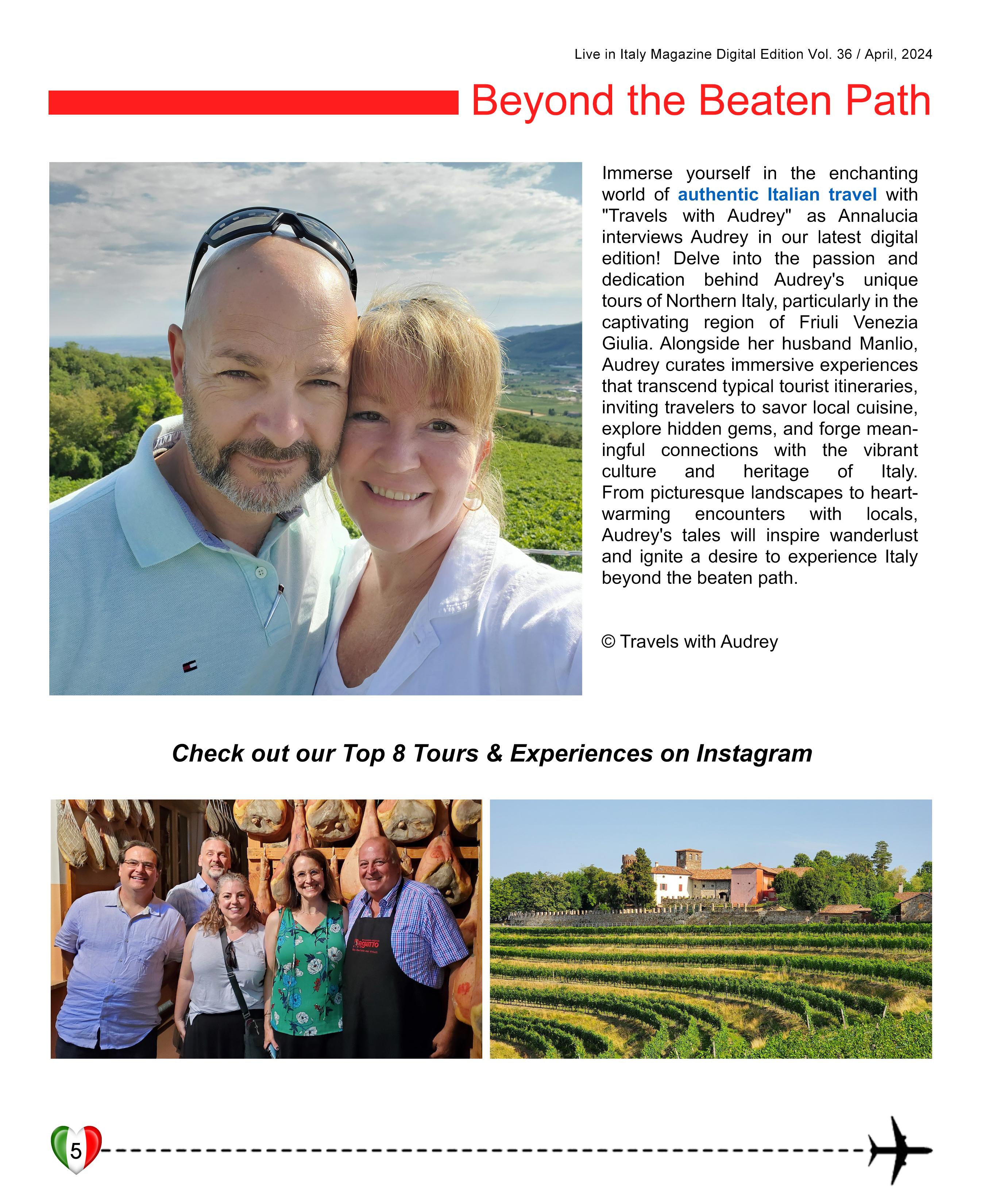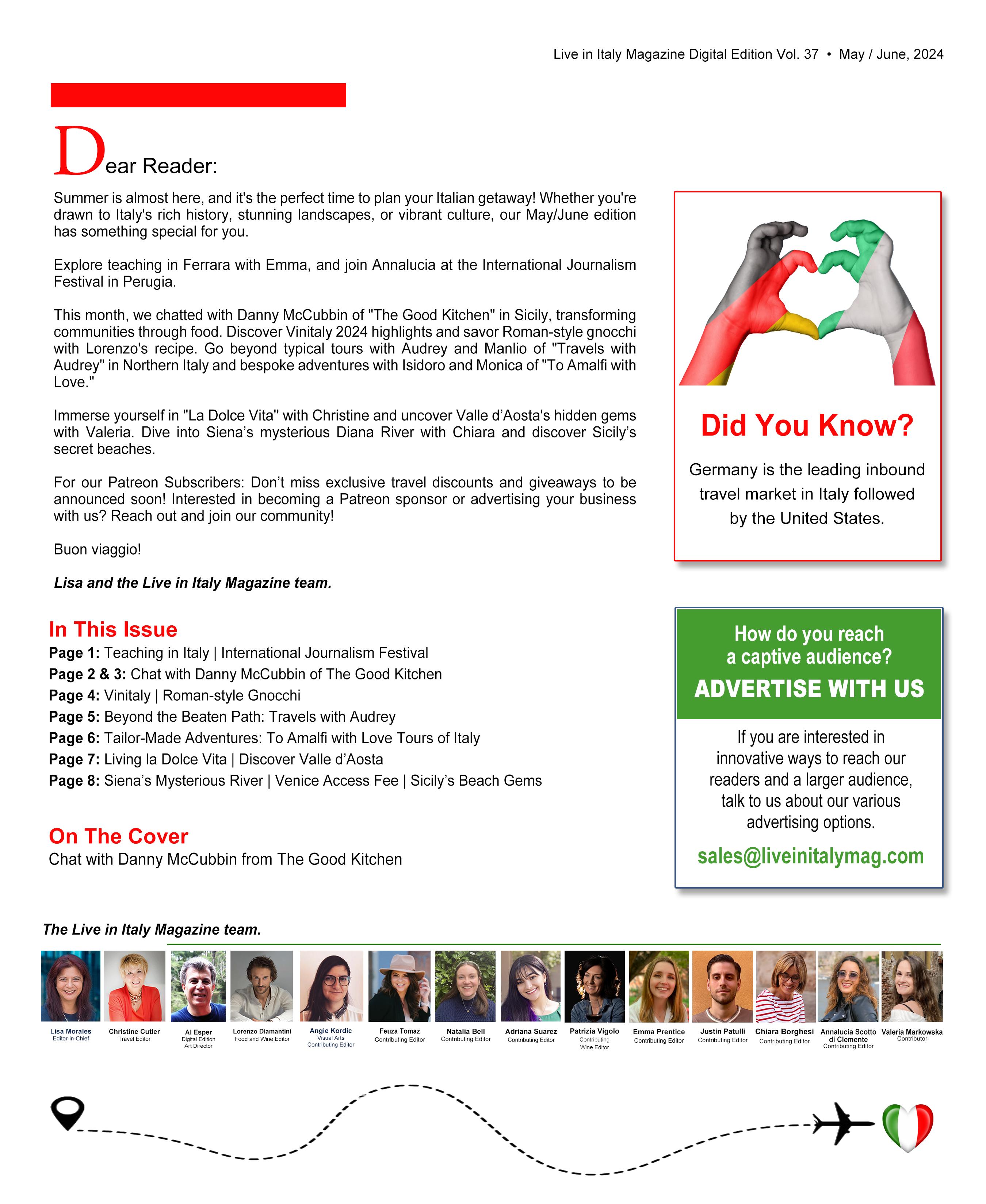 Summer is almost here, and it's the perfect time to plan your Italian getaway! Our May/June edition of Live in Italy Magazine is packed with travel inspiration, from teaching in Ferrara and the International Journalism Festival in Perugia to community-driven food initiatives in Sicily. Discover Vinitaly 2024 highlights, savor Roman-style gnocchi, and explore Northern Italy with "Travels with Audrey." Enjoy bespoke adventures with "To Amalfi with Love," immerse yourself in "La Dolce Vita," uncover Valle d’Aosta's hidden gems, and dive into Siena’s mysterious Diana River. Don’t miss exclusive travel discounts and giveaways coming soon for our Patreon sponsors!