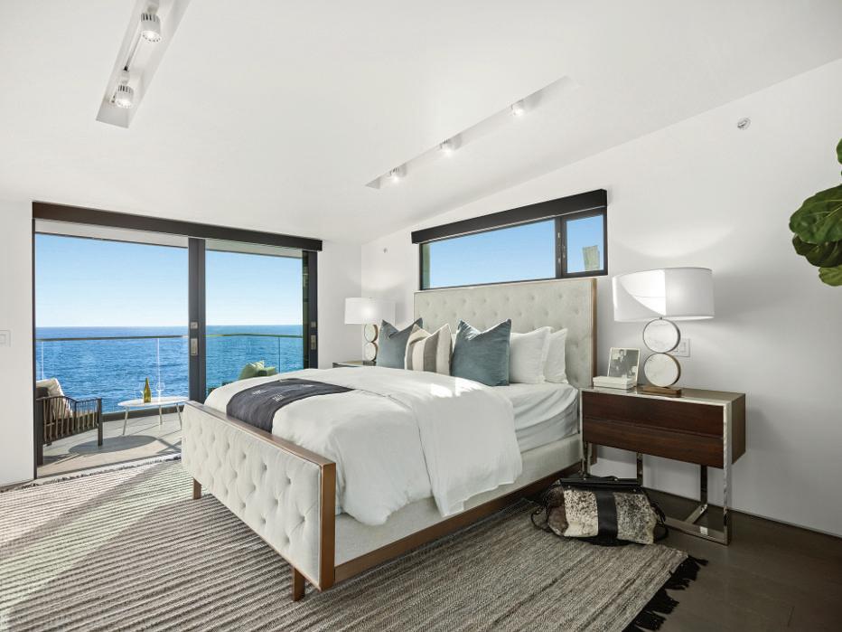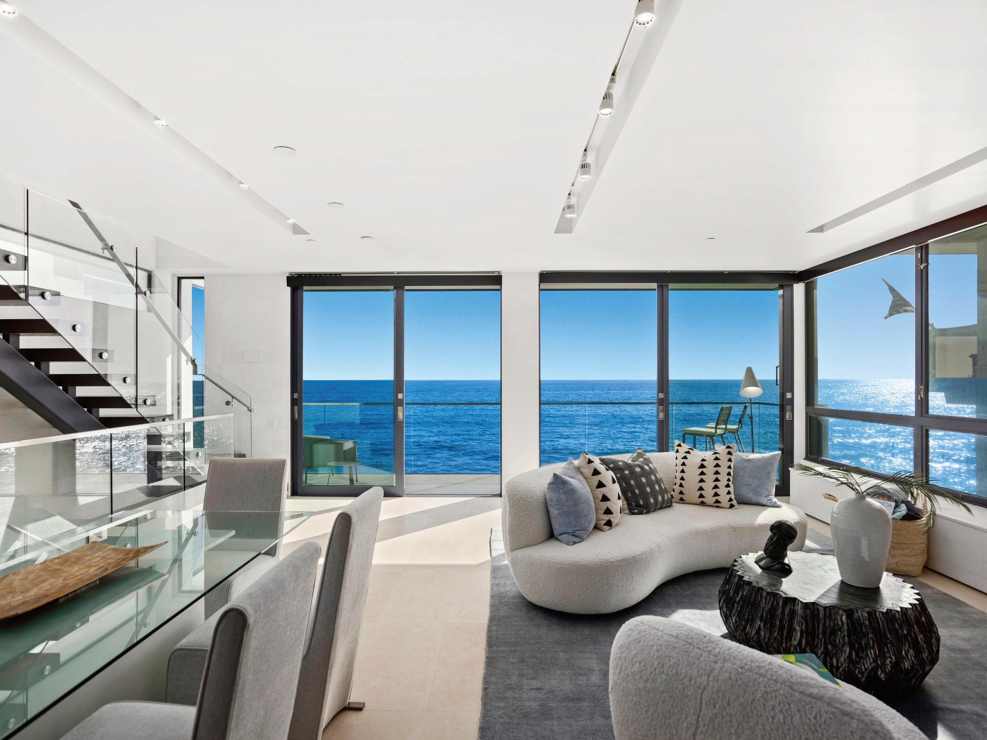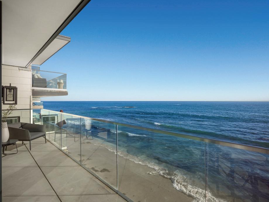 This stunning oceanfront Modern enjoys a coveted spot on the pristine sands of Brooks Street, just a stone's throw from Laguna Beach?s vibrant Village. Anchored on a dram atic setting, this sleek newly constructed seaside hom e appears to be floating on the ocean thanks to m assive walls of glass that fram e panoram ic Pacific, whitewater, coastline, Catalina and city-light views.