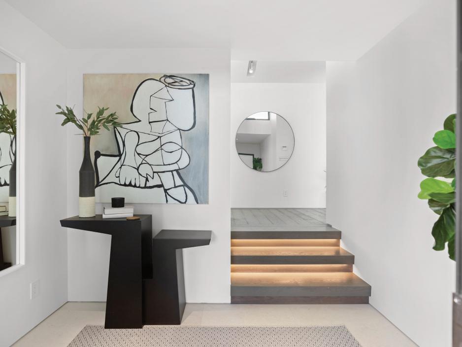 Horst Architects in concert with Brion Jeanette created the hom e, which provides a haven for sophisticated indoor and outdoor entertaining on a view-oriented deck and a m ain-level great room featuring a linear fireplace with underlit hearth, chic LED lighting fixtures, and distinctive art niches A two-level island that is destined to be a prim e spot for entertaining takes center stage in a sublim e kitchen with custom European cabinetry, 2 sinks and Miele high-end appliances.