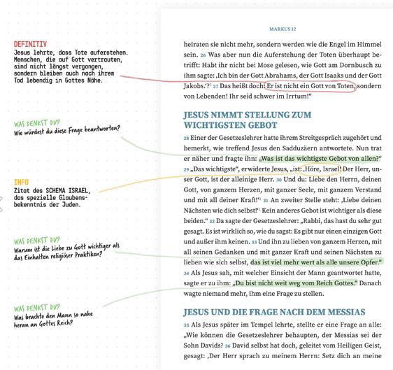 Der Schreiber des Markus-Evangeliums hat damals mit Sorgfalt Dinge erklärt und Hintergründe beleuchtet, die nur religiöse Leute ohne Erklärung verstanden. Vielleicht versteht man trotz der Erläuterungen im Bibeltext heute vieles nicht mehr. In dieser Spezialausgabe sind zentrale Passagen am Rand mit Infos und Fragen zum Nachdenken versehen. Ausserdem ist Platz für eigene Notizen.