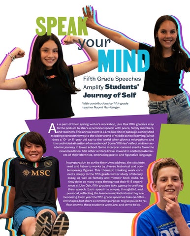 In preparation to scribe their own address, the students read and listen to works by diverse historical and con temporary figures. This thematic thinking work con nects deeply to the fifth grade winter study of literary essay, as well as fantasy and memoir book clubs. As they do in so many ways throughout their K-8 experi ence at Live Oak, fifth graders take agency in crafting their speech. Each speech is unique, thoughtful, and personal, reflecting the learners and individuals they are becoming. Each year the fifth grade speeches take on differ ent shapes, but share a common purpose: to give pause to re flect on who these students were, are, and strive to be.
