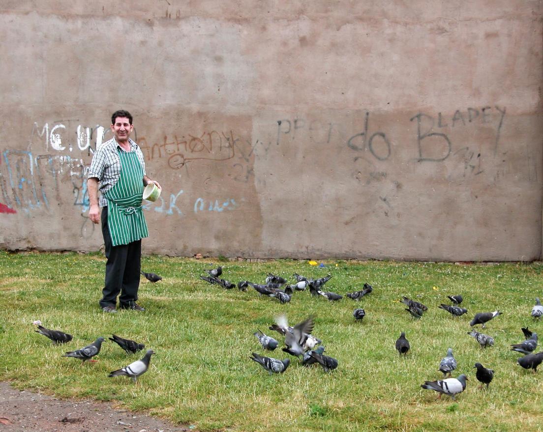 Chris, owner of Princes Chippy, High Park Street feeding the pigeons. (Before the ASBO) Photo Credit: Moira Kenny-Campbell