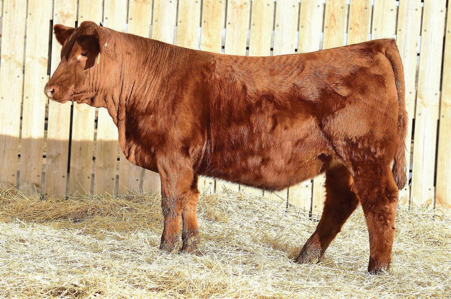 GE-EPDs • 5242N is another high percent Gelbvieh female that is clean-made and angular-fronted. She offers a touch more frame than the other red females in this offering but hails from the same cow family as Lot 73, in fact their dams are full genetic siblings. Her EPDs rank in the top 20% for $GAIN; top 25% for YW and CW; top 30% for SC; and top 35% for WW.