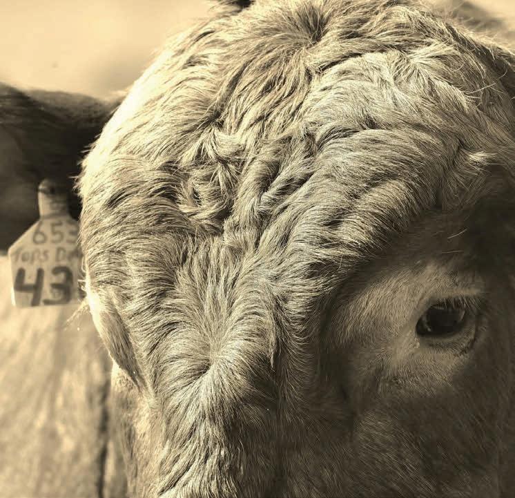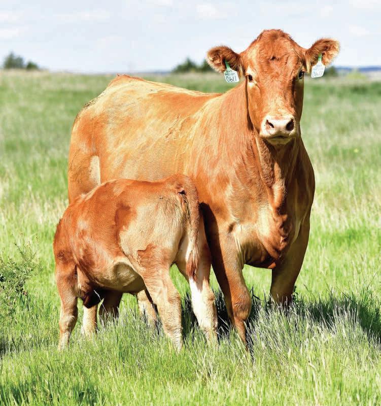 This year’s sale offering has exceeded the goals we have set for our program. The bulls are uniform in type regardless of breed percentage—thick, long-spined, easy fleshing, and exceptional on their feet and legs. The 2025 calf crop was weaned in mid-August due to drier pasture conditions and has excelled on our feed program. Bulls are developed on a high-fiber, roughagebased ration with ample space to exercise and structural longevity in mind. Our natural calves were raised on rugged pastures without supplementation and returned with excellent weaning weights.