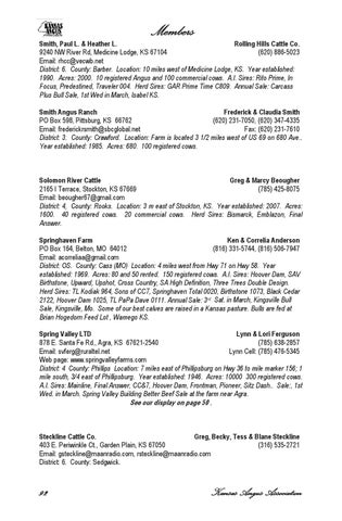 Solomon River Cattle Greg & Marcy Beougher 2165 I Terrace, Stockton, KS 67669 (785) 425-8075 Email: beougher67@gmail.com District: 4, County: Rooks. Location: 3 m east of Stockton, KS. Year established: 2007. Acres: 1600. 40 registered cows. 20 commercial cows. Herd Sires: Bismarck, Emblazon, Final Answer. Springhaven Farm Ken & Correlia Anderson PO Box 164, Belton, MO 64012 (816) 331-5744, (816) 506-7947 Email: acorreliaa@gmail.com District: OS. County: Cass (MO) Location: 4 miles west from Hwy 71 on Hwy 58. Year established: 1969. Acres: 80 and 50 rented. 150 registered cows. A.I. Sires: Hoover Dam, SAV Birthstone, Upward, Upshot, Cross Country, SA High Definition, Three Trees Double Design. Herd Sires: TL Kodiak 964, Sons of CC7, Springhaven Total 0020, Birthstone 1073, Black Cedar 2122, Hoover Dam 1025, TL PaPa Dave 0111. Annual Sale: 3rd Sat. in March, Kingsville Bull Sale, Kingsville, Mo. Some of our best calves are raised in a Kansas pasture. Bulls are fed at Brian Hogedorn Feed Lot , Wamego KS. Spring Valley LTD Lynn & Lori Ferguson 878 E. Santa Fe Rd., Agra, KS 67621-2540 (785) 638-2857 Email: svferg@ruraltel.net Lynn Cell: (785) 476-5345 Web page: www.springvalleyfarms.com District: 4 County: Phillips Location: 7 miles east of Phillipsburg on Hwy 36 to mile marker 156; 1 mile south, 3/4 east of Phillipsburg. Year established: 1946. Acres: 10000 300 registered cows. A.I. Sires: Mainline, Final Answer, CC&7, Hoover Dam, Frontman, Pioneer, Sitz Dash.. Sale:, 1st Wed. in March. Spring Valley Building Better Beef Sale at the farm near Agra.