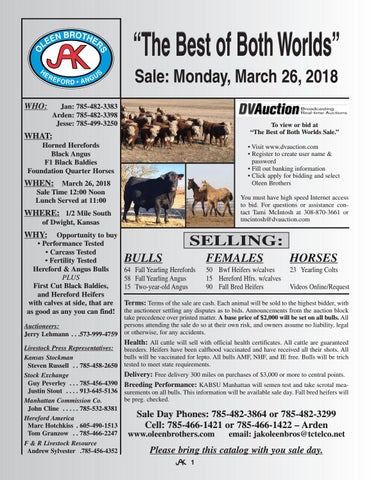 Auctioneers: Jerry Lehmann . . .573-999-4759 Livestock Press Representatives: Kansas Stockman Steven Russell . . 785-458-2650 Stock Exchange Guy Peverley . . . 785-456-4390 Justin Stout . . . . 913-645-5136 Manhattan Commission Co. John Cline . . . . . 785-532-8381 Hereford America Marc Hotchkiss . 605-490-1513 Tom Granzow . . 785-466-2247 F & R Livestock Resource Andrew Sylvester .785-456-4352