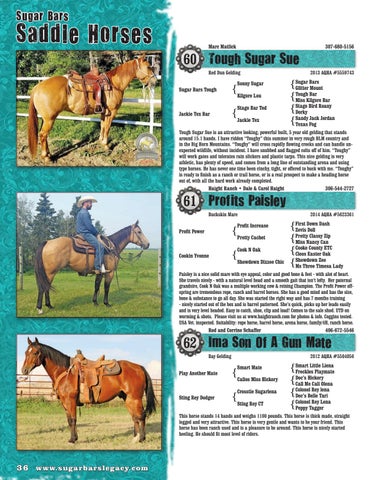 Sugar Bars Sonny Sugar Glitter Mount Sugar Bars Tough Tough Bar Kilgore Lou Miss Kilgore Bar Stage Bird Roany Stage Bar Ted Dorky Jackie Tex Bar Sandy Jack Jordan Jackie Tex Texas Fog Tough Sugar Sue is an attractive looking; powerful built, 5 year old gelding that stands around 15.1 hands. I have ridden “Toughy” this summer in very rough BLM country and in the Big Horn Mountains. “Toughy” will cross rapidly flowing creeks and can handle unexpected wildlife, without incident. I have snubbed and flagged colts off of him. “Toughy” will work gates and tolerates rain slickers and plastic tarps. This nice gelding is very athletic, has plenty of speed, and comes from a long line of outstanding arena and using type horses. He has never one time been cinchy, tight, or offered to buck with me. “Toughy” is ready to finish as a ranch or trail horse, or is a real prospect to make a heading horse out of, with all the hard work already completed. Haight Ranch • Dale & Carol Haight 306-544-2727