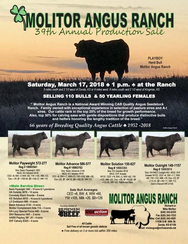 SELLING 110 BULLS & 50 YEARLING FEMALES “ Molitor Angus Ranch is a National Award Winning CAB Quality Angus Seedstock Ranch. Family owned with exceptional experience in selection of pasture sires and A-I sires. Our cattle rank in the top 20% of the breed for growth performance. Also, top 30% for calving ease with gentle dispositions that produce distinctive bulls and heifers honoring the lengthy tradition of the breed.”