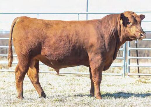 A son of the high-selling bull in our 2021 sale, WINDRUSH 84S JULIAN 006H, here is one that balances performance with muscle over his top and great feet. He is a lowintake bull whose daughters will perform in a rugged environment. His extended pedigree is a “who’s who” of dependable Red Angus genetics.