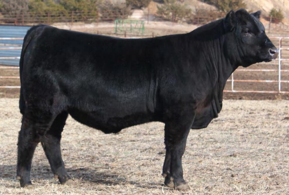 A complete made well balanced bull who is square-hipped and bold sprung in the center part of his rib cavity. In addition, he is clean-fronted and smooth-shouldered. This bull combines an individual birth ratio of 96 with an individual weaning ratio of 102 from a dam with a progeny weaning ratio of 103 on two calves.