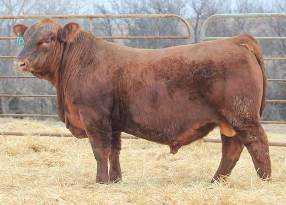 Thick, long, and dark red bull that has always been one of the top bulls of this year’s set. Will sire calves that cattle buyers love with lots of growth and muscle. Balanced set of numbers that covers all the bases with 15 of the 19 EPDs being in the top half of the breed or better. If you hear him breathing loudly in the pens, do not be alarmed as he has always had that, but it clearly hasn’t slowed him down, being the 2nd highest YW red bull in the sale.