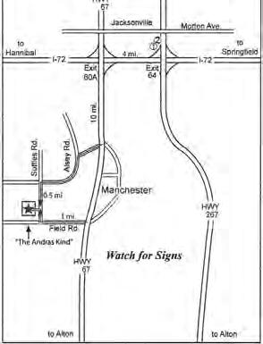 From North: Follow US-67 South to Manchester, 10 miles South of I-72 interchange. Turn Right onto [Hwy 7] the Alsey-Manchester Blacktop. Continue West toward Alsey for 1.5 miles, to first Crossroad (Suttles Rd). Turn Left (South) onto Suttles Road. Follow Suttles Rd for about a mile to first place on the right (Andras Stock Farm sign). Proceed down farm lane to the 2nd Red and White shed (sale facility).