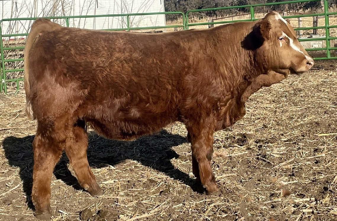 Purebred Simmental bull out of a full Fleckvieh cow, designed to produce very highmilking replacement females. A strong weaning weight of 713 pounds with a 102% index adds growth and balance to this maternal-focused package.