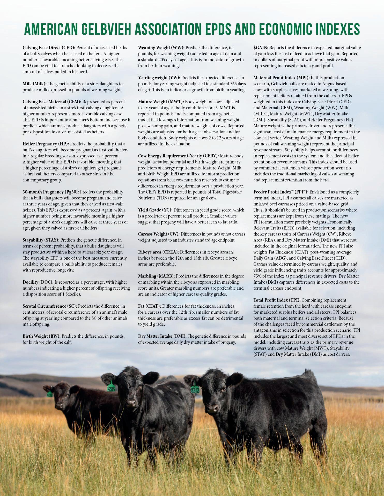 The Genomically Enhanced EPDs listed in the sale book were obtained from the American Gelbvieh Association, the American Angus Association, and the American Red Angus Association and are current as of 2/20/2021. EPDs are subject to change with updated data processed through the AGA, AAA, and RAA between sale day and registration transfers. Weaning weights provided are adjusted weights calculated by the respective associations. All bulls have been Genomically Enhanced through Geneseek. EPDs being enhanced allows for greater accuracy of EPDs.