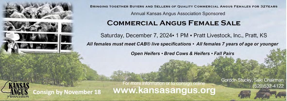 Before we turn the calendar to 2025,DON’T MISS : the fall sales listed on page 19 and taking a minute to look ahead to spring offerings; renewing your annual membership, see page 14; reserving your space in the 2025 Kansas Angus Directory, information is on page 1 ; consigning to or encouraging your seedstock customers to participate in the 33rd Commercial Angus Female Sale on December 7 in Pratt and marking your calendar to attend the Kansas Angus Annual Meeting Banquet and Futurity Junior Show on January 24-25.