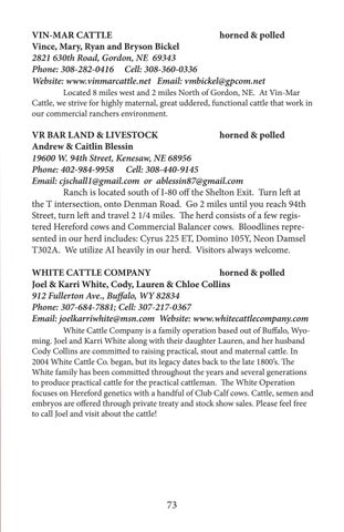 VR BAR LAND & LIVESTOCK horned & polled Andrew & Caitlin Blessin 19600 W. 94th Street, Kenesaw, NE 68956 Phone: 402-984-9958 Cell: 308-440-9145 Email: cjschall1@gmail.com or ablessin87@gmail.com Ranch is located south of I-80 off the Shelton Exit. Turn left at the T intersection, onto Denman Road. Go 2 miles until you reach 94th Street, turn left and travel 2 1/4 miles. The herd consists of a few registered Hereford cows and Commercial Balancer cows. Bloodlines represented in our herd includes: Cyrus 225 ET, Domino 105Y, Neon Damsel T302A. We utilize AI heavily in our herd. Visitors always welcome. WHITE CATTLE COMPANY horned & polled Joel & Karri White, Cody, Lauren & Chloe Collins 912 Fullerton Ave., Buffalo, WY 82834 Phone: 307-684-7881; Cell: 307-217-0367 Email: joelkarriwhite@msn.com Website: www.whitecattlecompany.com White Cattle Company is a family operation based out of Buffalo, Wyo-