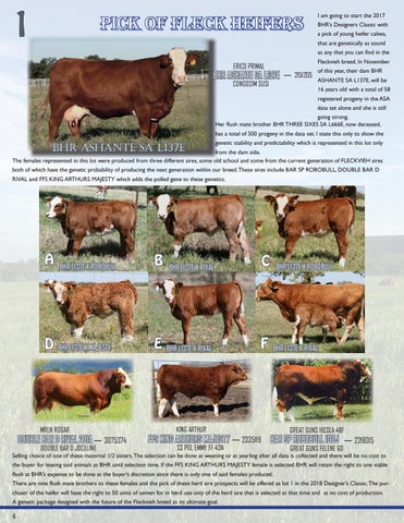 Selling choice of one of these maternal 1/2 sisters. The selection can be done at weaning or at yearling after all data is collected and there will be no cost to the buyer for leaving said animals at BHR until selection time. If the FFS KING ARTHURS MAJESTY female is selected BHR will retain the right to one viable flush at BHR’s expense to be done at the buyer’s discretion since there is only one of said females produced. There are nine flush mate brothers to these females and the pick of these herd sire prospects will be offered as lot 1 in the 2018 Designer’s Classic. The purchaser of the heifer will have the right to 50 units of semen for in herd use only of the herd sire that is selected at that time and at no cost of production. A genetic package designed with the future of the Fleckvieh breed as its ultimate goal.
