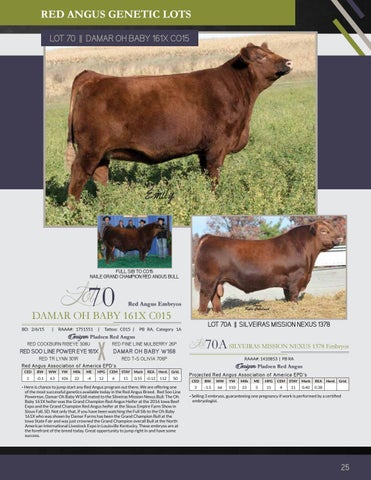 - Here is chance to jump start any Red Angus program out there, We are offering one of the most successful genetics available today in the Red Angus Breed. Red Soo Line Powereye, Damar Oh Baby W168 mated to the Silveiras Mission Nexus Bull. The Oh Baby 161X heifer was the Grand Champion Red Angus Heifer at the 2016 Iowa Beef Expo and the Grand Champion Red Angus heifer at the Sioux Empire Farm Show in Sioux Fall, SD. Not only that, if you have been watching the Full Sib to the Oh Baby 161X who was shown by Damar Farms has been the Grand Champion Bull at the Iowa State Fair and was just crowned the Grand Champion overall Bull at the North American International Livestock Expo in Louisville Kentucky. These embryos are at the forefront of the breed today. Great opportunity to jump right in and have some success.