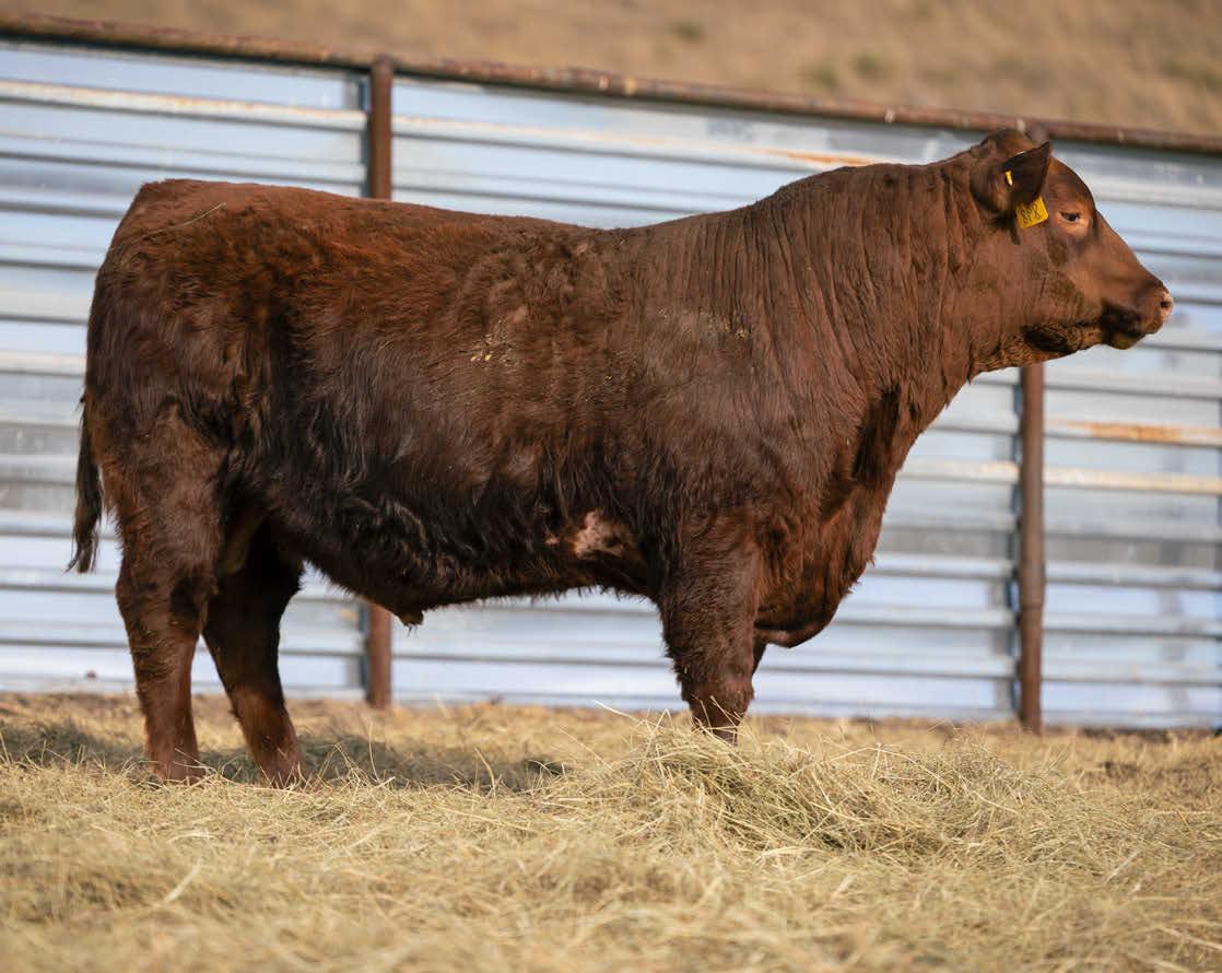 Sired by Recharge and out of a Linebacker cow, this bull combines guts and muscle with a smooth, easy-fleshing design. Proven genetics on both sides of the pedigree make him a true power bull and a pasture standout.