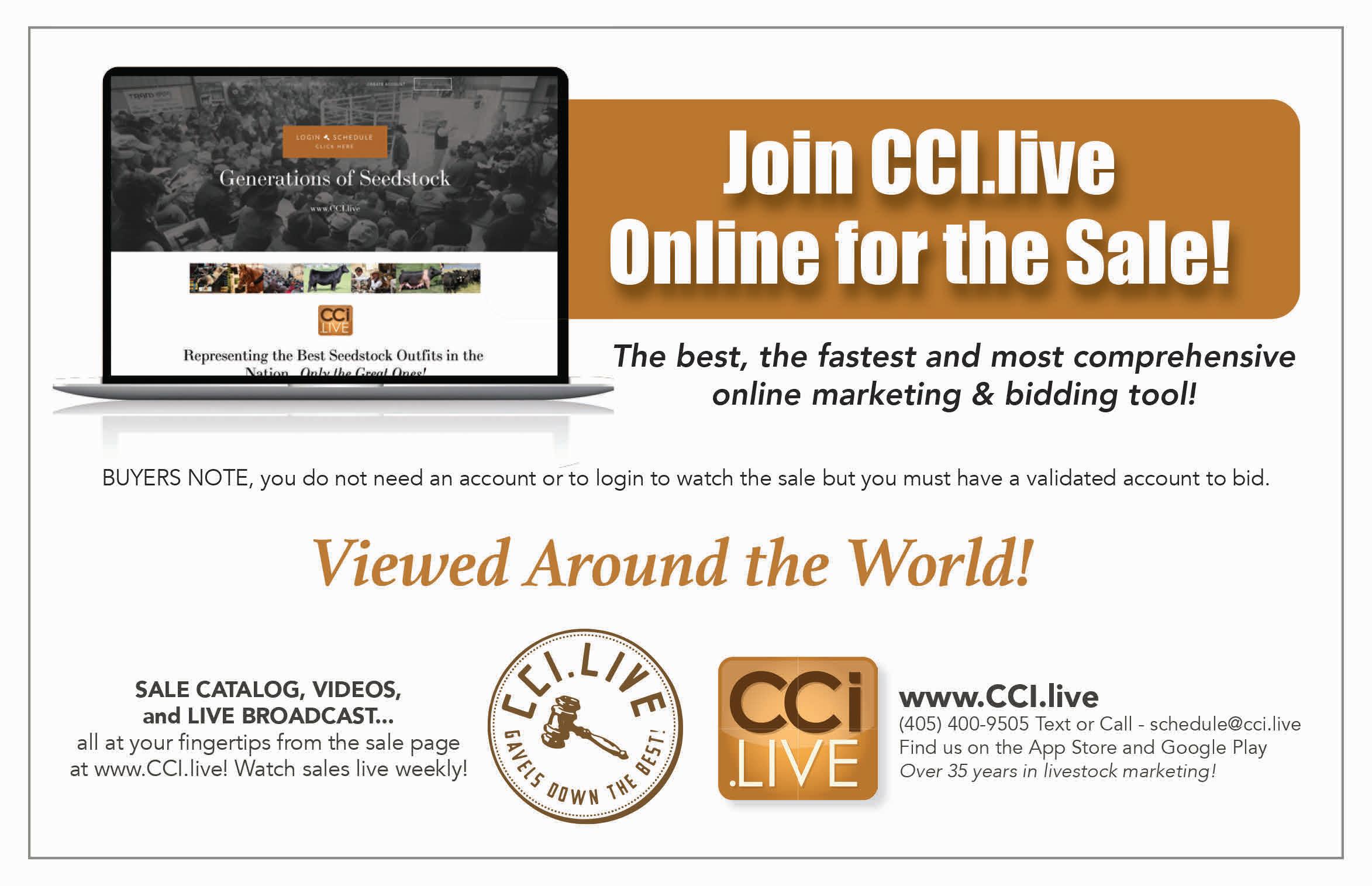 Bid online and watch the sale live on CCi.live! Call/Text: 405-400-9505 • schedule@cci.live