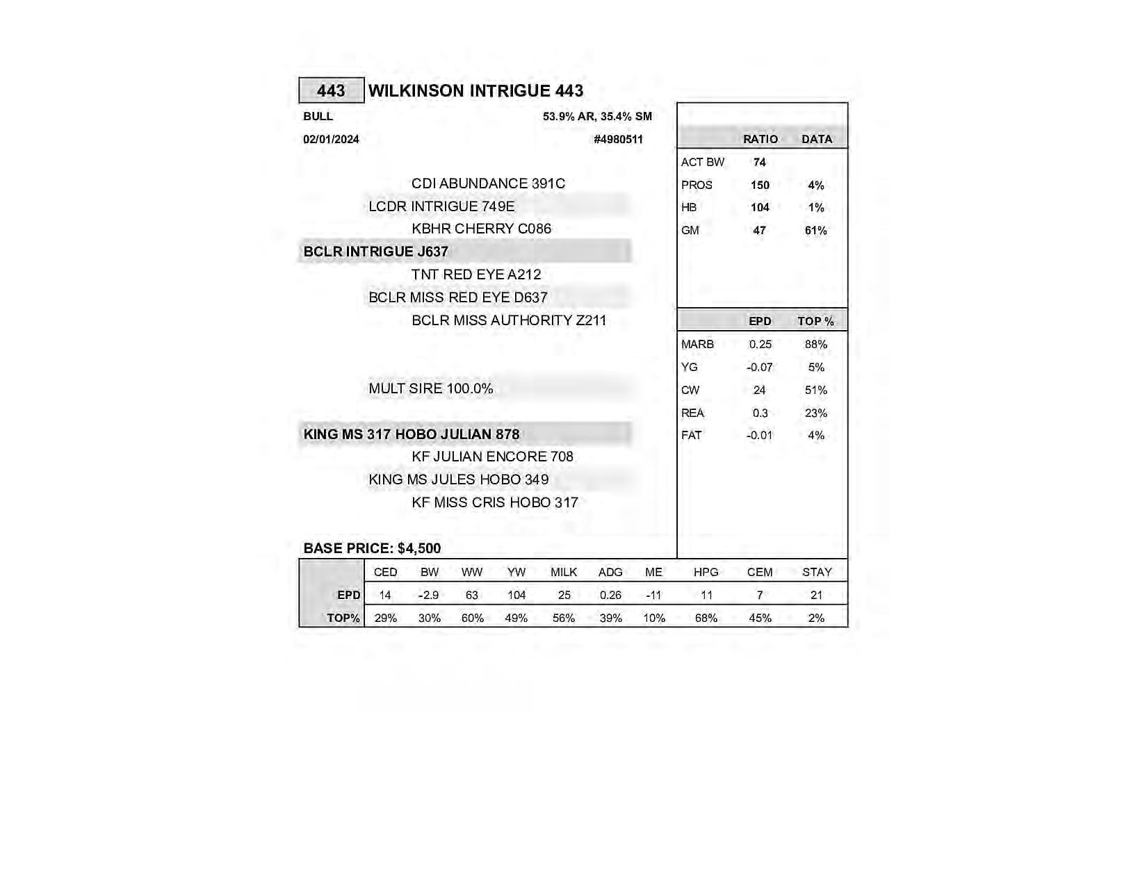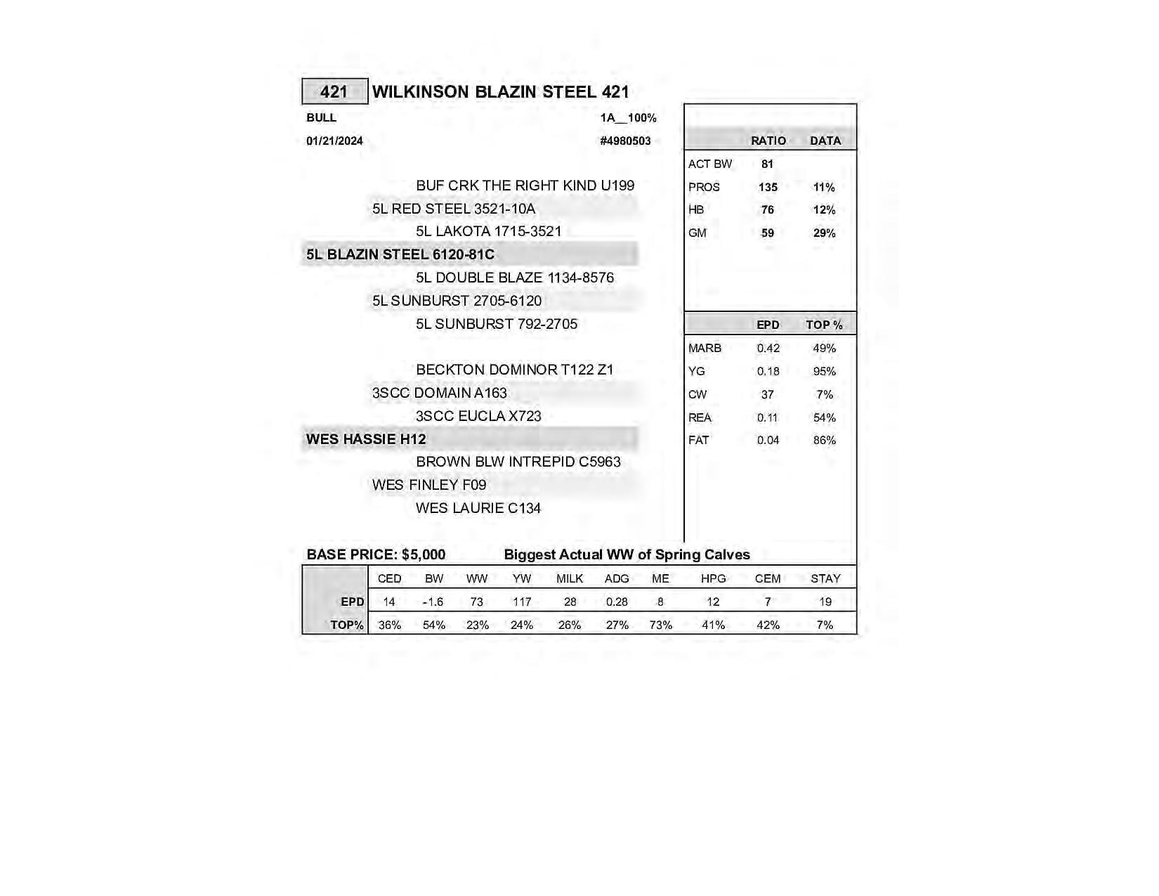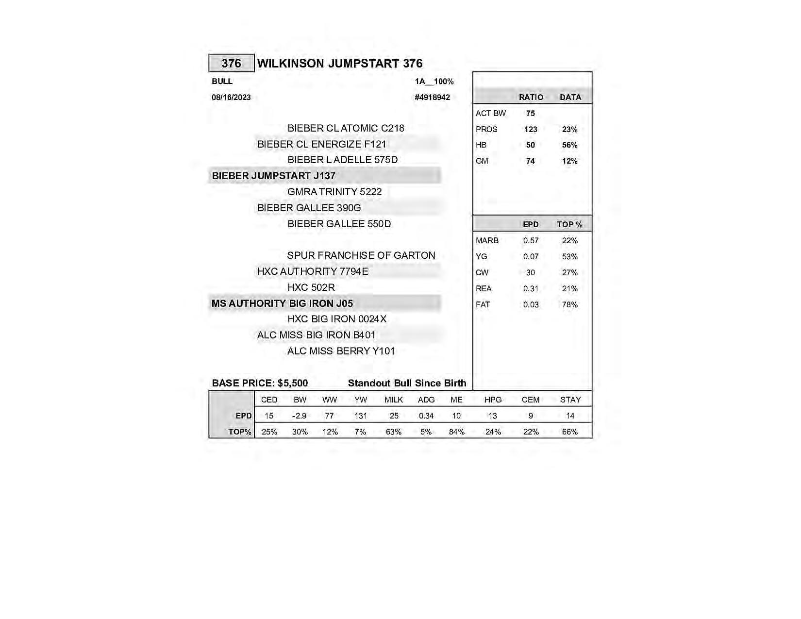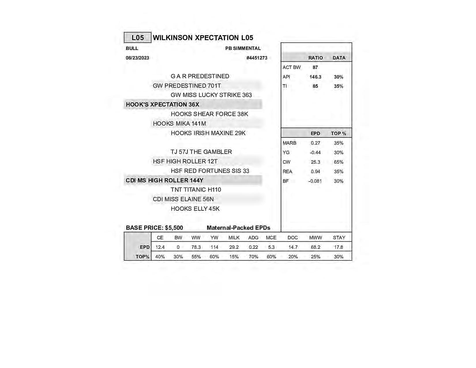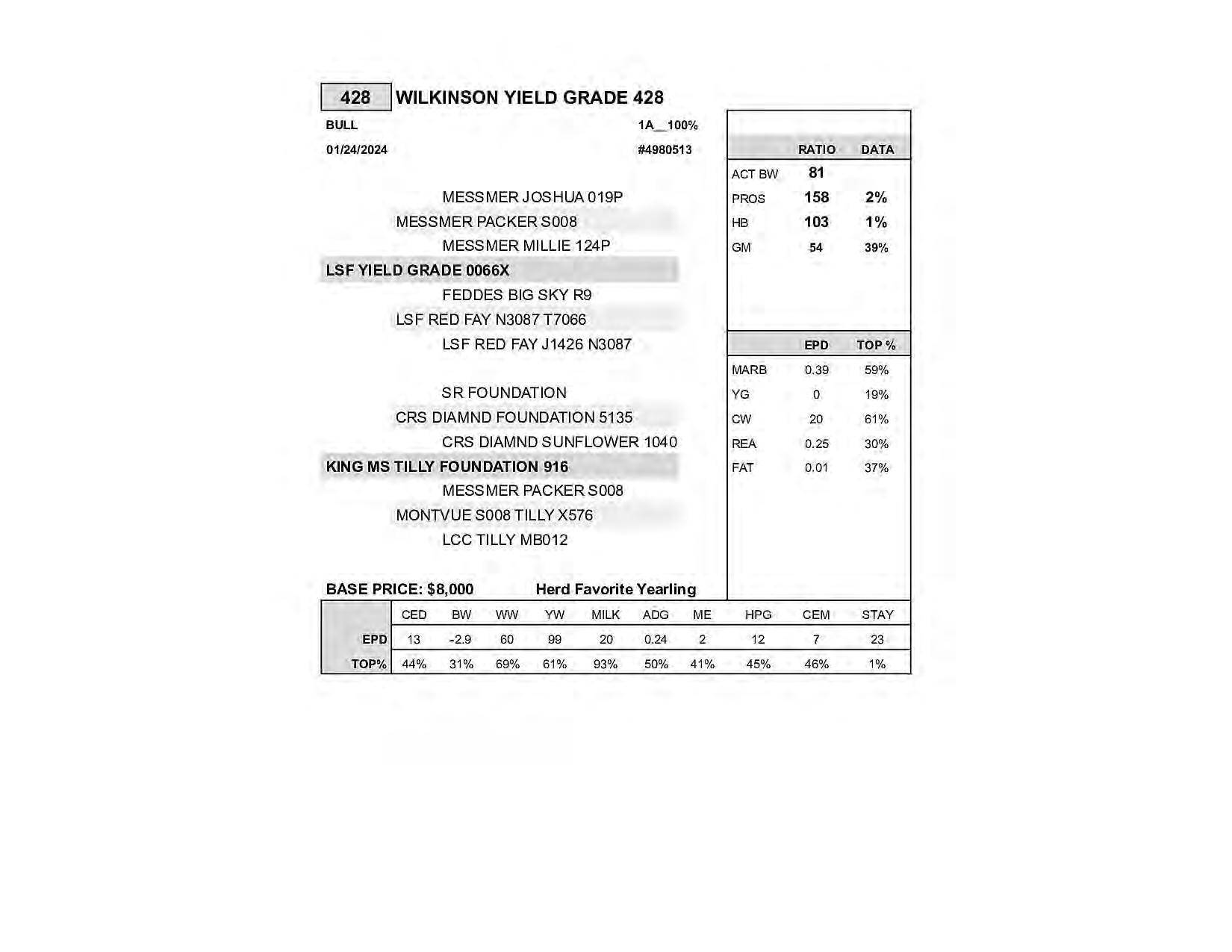 This year we made a few changes to base prices for di erent bulls. Along with the current record-high price market, our need for a few more bulls on the ground this year has led us to price some animals higher, due to our desire to possibly retain them within our program. However, we are happy to sell them if we can get what we feel they are worth. Furthermore, there are a few bulls premiered without a price (382 - 1A Red Angus and L04 - PB Simmental). These bulls have been standouts since birth, and due to their genetic potential and phenotype, we are not putting a price on them. However, we would be open to negotiation on outright or part-interest purchase to any parties interested. If someone is interested and would like to visit about these 2 bulls (382 & L04) please reach out for more details.
