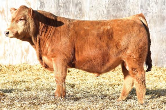 GE EPDs • 4514M is a new sire we selected to incorporate some outcross genetics within our herd. He is long bodied and thick from front to back with great scrotal development and a quiet disposition. His dam is a full ET sister to our herd sire BABR 1375H and he himself is a maternal brother to the dam of Lot 62. He ranks in the top 15% for BW and top 30% for CED.