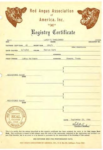 Whatbeganasasmallinvestmentin1964withthepurchaseofaRedAngusbull, evolvedintoaprominentherdof RedAngusinWestTexas.CliffordandDennis Halfmannpurchasedthatbull,namedTanglewood,fromagentlemaninAbilene,Texas,wholivedonTanglewoodStreet.Thatsinglepurchasebegana60-yearregistered RedAngusseedstockherdnowpassedontothenextgenerations.