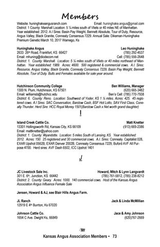 Members Website: huninghakeangusranch.com Email: huninghake.angus@gmail.com District: 1 County: Marshall Location: 5 ¼ miles south of Vliets or 40 miles NE of Manhattan. Year established: 2012. A.I Sires: Basin Pay Weight, Bennett Absolute, Tour of Duty, Resource, Angus Valley, Black Granite, Connealy Consensus 7229. Annual Sale: Dikeman-Huninghake Premium Genetic March 10, 2017 Wamego, Ks Huninghake Angus Leo Huninghake 2633 26th Road, Frankfort, KS 66427 (785) 292-4537 Email: mhuning@diodecom.net Cell: (785) 556-2648 District: 1. County: Marshall. Location: 5 ¼ miles south of Vliets or 40 miles northeast of Manhattan. Year established: 1989. Acres: 4600. 500 registered & commercial cows. A.I. Sires: Resource, Angus Valley, Black Granite, Connealy Consensus 7229, Basin Pay Weight, Bennett Absolute, Tour of Duty. Bulls and Females available for sale year around. Hutchinson Community College Ben Williams, Manager 1300 N. Plum, Hutchinson, KS 67501 (620) 665-3482 Email: williamsb@hutchcc.edu Ben’s Cell: (785) 770-7938 District: 6. County: Reno. Location: Southwest of Yoder, KS 1 ½ miles. Acres: 425. 45 registered cows. A.I Sires: SAC Conversation, Barstow Cash, BSF Hot Lotto, SAV First Class, Coneally Thunder. Herd Sire: HCC Royal Money 1501(Barstow Cash x Net worth grand daughter)