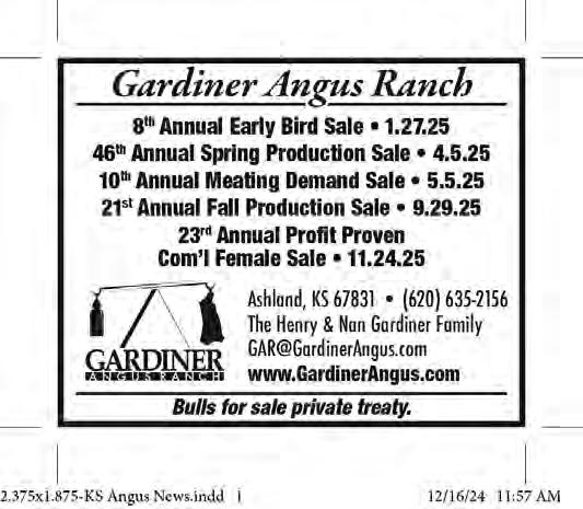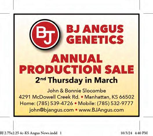As we close out the end of the year and begin 2025, I want to thank you all for the opportunity to serve and represent the Angus breeders of Kansas as your Kansas Angus Association President. I have enjoyed my time in this role and appreciate the dedication of our current board members. As the new officer team comes on board, we will continue to work on finding more opportunities for our members to promote their genetics, operations and the Angus breed. Please reach out to anyone on the board with new ideas or suggestions that you may have.