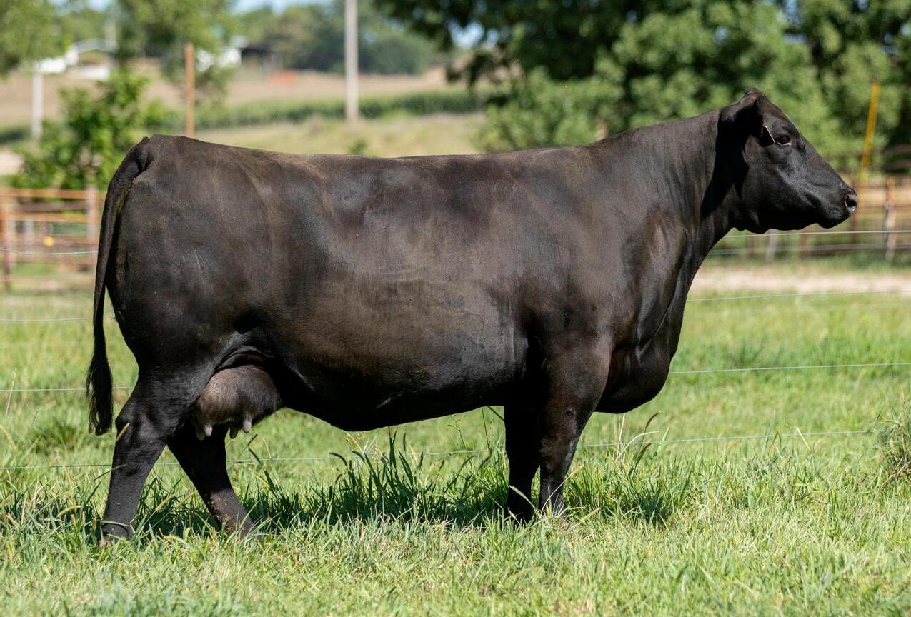 Here’s an easy fleshing, docile, nice uddered herd cow by Jindra Acclaim. High in fertility, she’s stuck AI all 4 years. This year’s Downpour bull calf, weaned off at 790 lbs, and weighed 902 at booster shots. He ranks in the top 5% for phenotype of our 2023 bull calves. Also, she’s the dam of Lot 7, a fancy Downpour heifer from last year’s Belles of the Grade Female Sale, purchased by Blue Valley Angus, McCool Junction, NE.