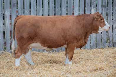 Horned 100% Full Fleckvieh. Maggie is a powerful broody female that exemplifies what a productive Simmental bred heifer should look like. She is bold her in her rib shape, wide based and carries natural muscle while maintaining a clean feminine front end. Observed breeding date Mar. 20, vet confirmed early Jan. calving.