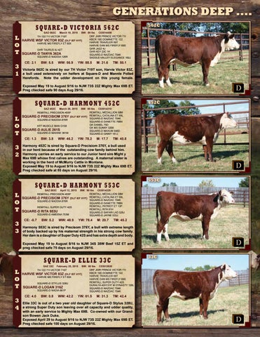 Harmony 452C is sired by Square-D Precisiom 376Y, a bull used in our herd because of the outstanding cow family behind him. Harmony carries an early service to our Junior herd sire Might y Max 69B whose first calves are outstanding. A maternal sister is working in the herd of McMurry Cattle in Montana. Exposed May 19 to August 9/16 to NJW 73S 22Z Mighty Max 69B ET. Preg checked safe at 85 days on August 29/16.