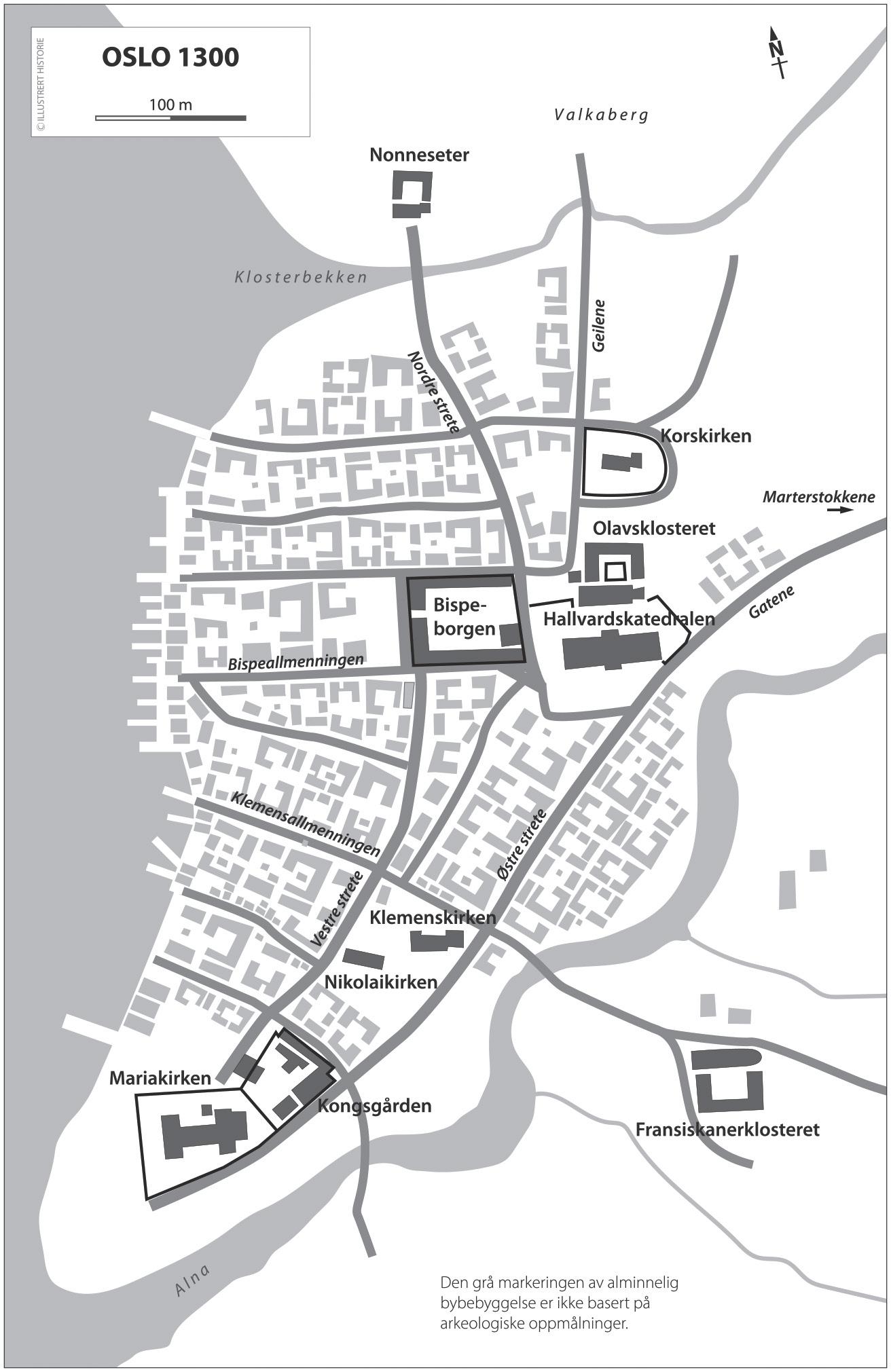 Vi ankom Bjarnegård idet klokkene i domkirken ringte til messe. Den brede vestfronten var vendt mot Oslo-bispens borg og torget, som nå var stille. Like ved lukket de boklærde domi nikanernes Olavskloster seg som et kvadrat rundt munkene og lekbrødrenes liv. Vi gikk inn på gårdsplassen, kranset av geitefjøset, høyløa og eldhuset. Bjarnegård var et av byens få steinhus, bygget i to etasjer med glassruter i vinduene og en svalgang som vendte mot gårdsplassen. Lukten av stekt kjøtt sivet ut fra bygården ved siden av, og jeg hørte en klagende lyd fra magen.
