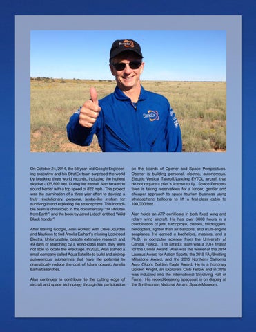 On October 24, 2014, the 58-year- old Google Engineering executive and his StratEx team surprised the world by breaking three world records, including the highest skydive - 135,899 feet. During the freefall, Alan broke the sound barrier with a top speed of 822 mph. This project was the culmination of a three-year effort to develop a truly revolutionary, personal, scuba-like system for surviving in and exploring the stratosphere. This incredible team is chronicled in the documentary “14 Minutes from Earth”, and the book by Jared Lidech entitled “Wild Black Yonder”.