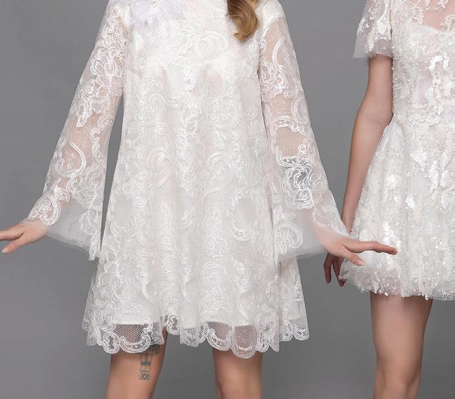 JOY (RIGHT): Made of sequins and beaded lace with Chantilly lace lining, this short number is ideal for young, adventurous brides with a flair for fashion. It’s shown here with the matching jacket. Pair with the Symphony overskirt for a more dramatic second look.