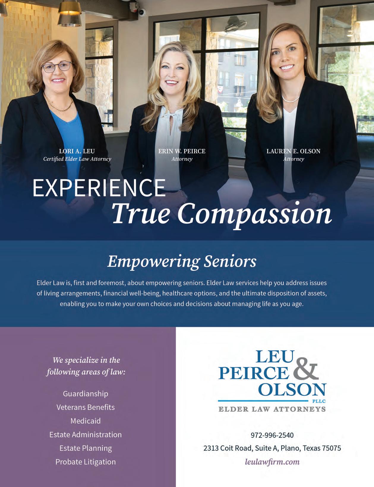 Ths year, resolve to take the time to crafta thoughtful, and thorough, estate plan. Educate yourself on your options, and seek qualifid professional advice on legal documents, healthcare, insurance, and fiancial planning. A little planning now goes a long way towards ensuring that you and your loved ones are protected, no matter what the future holds. Lori Leu, Erin Peirce, Lauren Olson, and James Sifford are Elder Law attorneys with Leu, Peirce & Olson, PLLC located in Plano, Texas. They can be reached at 972-996-2540.