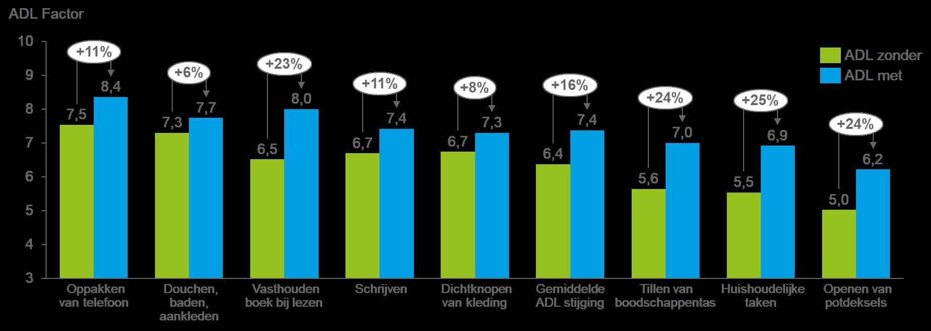 Er is algemene verbetering, maar de meest relatieve verbetering is te zien bij "huishoudelijke taken", "openen van potdeksels" en "boodschappen tillen". De groep patiënten die geen of kleine problemen ervoer, was beperkt