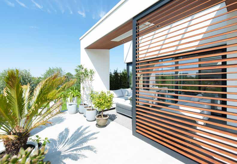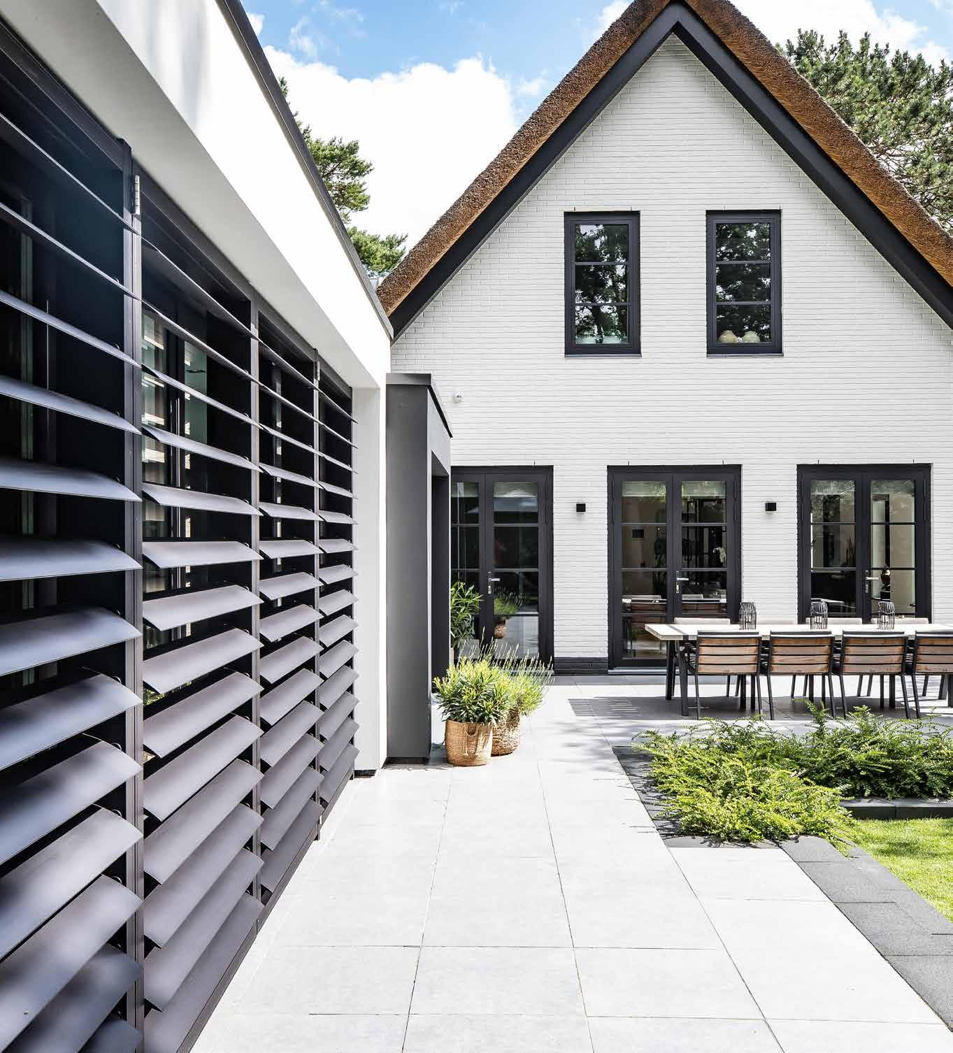 ENSCHEDE Bij deze villa zijn aan de voor- en achterzijde elektrisch bedienbare louvrepanelen toegepast. Deze geven de woning nog meer body. Daarnaast bieden ze veel privacy en reguleren ze de lichtinval. De buitenkamer is tevens voorzien van elektrisch draaibare louvres; deze bieden privacy en weren, indien nodig, de wind.