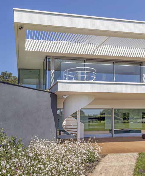 HOLTEN Een echte eyecatcher. De organische vorm van de trap in combinatie met het strakke louvredak geeft deze moderne villa een spannende twist. De witte aluminium louvres zijn 180 graden draaibaar en benadrukken het architectonisch design. Met deze louvres reguleer je het licht zoals je wilt. Zijn de louvres gesloten? Dan is het dak ook geheel waterdicht.