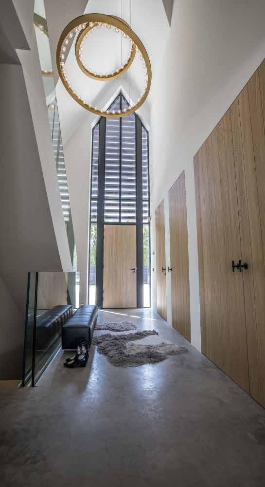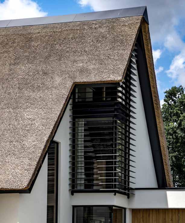 OOSTERHOUT De elektrisch bedienbare louvrepanelen volgen de daklijn elegant door de schuin afgezaagde louvres. De panelen geven de woning architectonische diepgang en zorgen voor verrassende lichtval in het interieur. Perfect als zonwering en verduistering voor de achterliggende vertrekken.