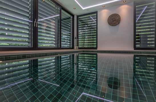 BENTVELD De louvrepanelen bij deze wellness ruimte geven je de privacy die je wenst in het zwembad en houden de temperatuur binnen constant. De louvres zijn 180 graden elektrisch draaibaar en geven je de mogelijkheid te spelen met het licht. Bepaal zelf de sfeer.
