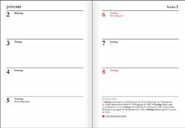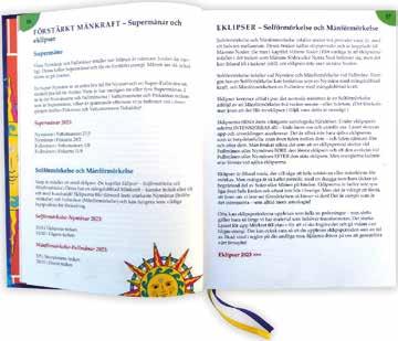 På varje veckouppslag finns en ruta med ”Veckans Astro”, där du kan se de viktigaste astrologiska händelserna för veckan. Till varje vecka hör också en inspirerande text. Det finns färgmarkeringar på de olika avsnitten i boken, så att det ska gå snabbt och lätt att slå upp det du söker. Boken är försedd med två läsband att lägga som bokmärken. Ord ca pris: 349:-