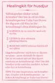 Det här är ett kit från kristallexperten Yulia Van Doren ur boken Kristallmagi, för dig som vill föra in lite kristallmagi i dina älsklingars liv. Kitet innehåller: karneol för mod och styrka, citrin för glädje och rosenkvarts för kärlek. Så här gör du: Lägg kristallerna i närheten av djurets sovplats - utom räckhåll för djuret. Det är ett enkelt sätt att låta djuret omslutas av kristallenergi. Obs! Om ditt husdjur tycks undvika området, ta bort eller byt ut kristallerna.