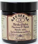 Havtorn & Björk Apotekar Mirakelsalva Oljan från fruktkött har hög koncentration av karoten. Oljan från frö, har höga halter av omega 3 och 9. Extremt mjukgörande för torr hud. Mot klåda av insektsstick och lindrig solbränna. Björkolja är bra mot hudbristningar. Fräsch doft! Vårdande för både kropp och ansikte. Ger lite färg och kan färga av sig om man tar för mycket. 60 ml. Ingredienser: Ekologiskt kakaosmör, ekologiskt bivax, ekologisk rapsolja, Havtornsolja från frö och frukt, e-vitamin, eterisk olja av Björk.