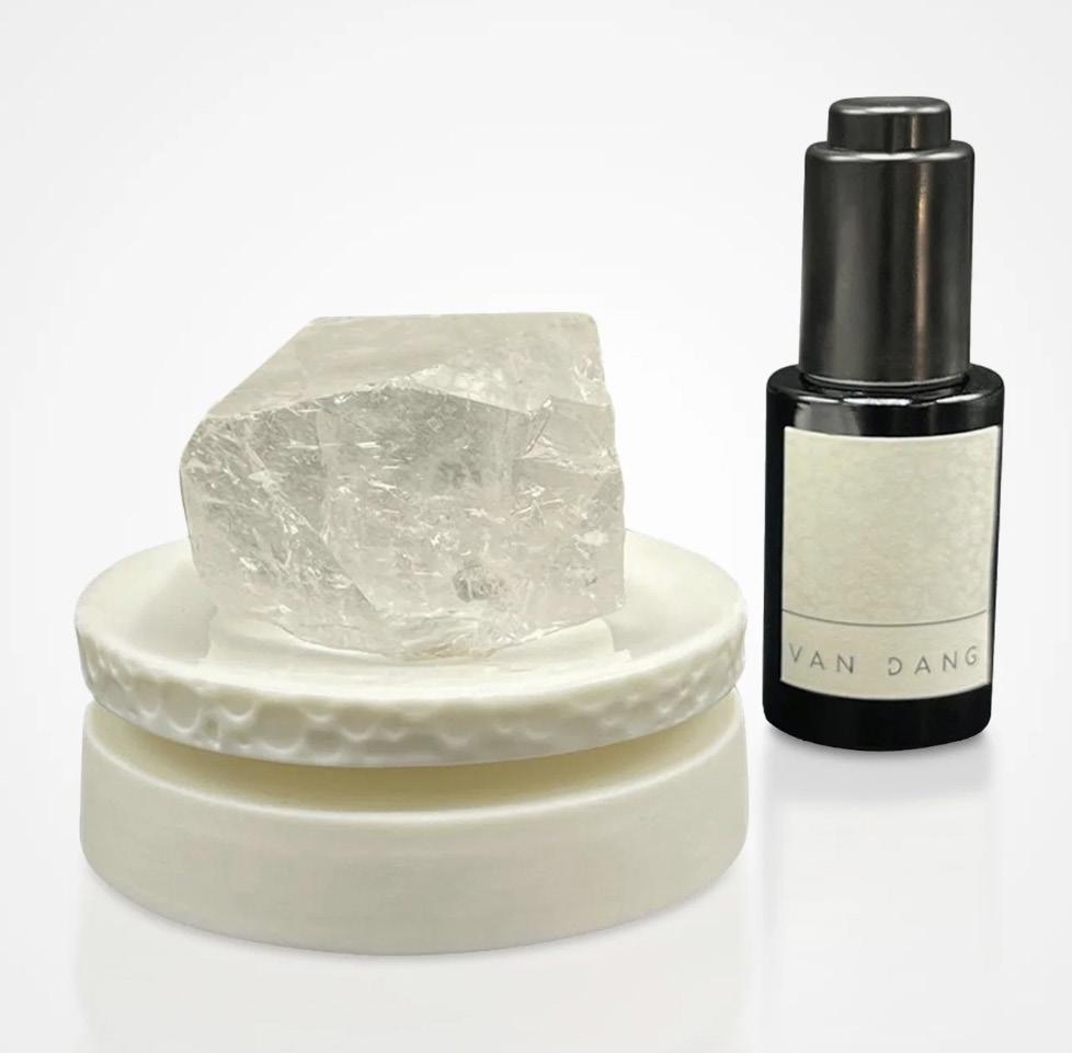 The Clear Quartz Buddhapada Meditation Set features a matte porcelain pedestal with a glazed top. The clear quartz is known to have immense healing properties and is said to amplify energy by absorbing, storing, releasing, and regulating it. It also aids in higher concentration and better memory. Buddhapada is a scent designed for aura cleansing and communing higher powers.