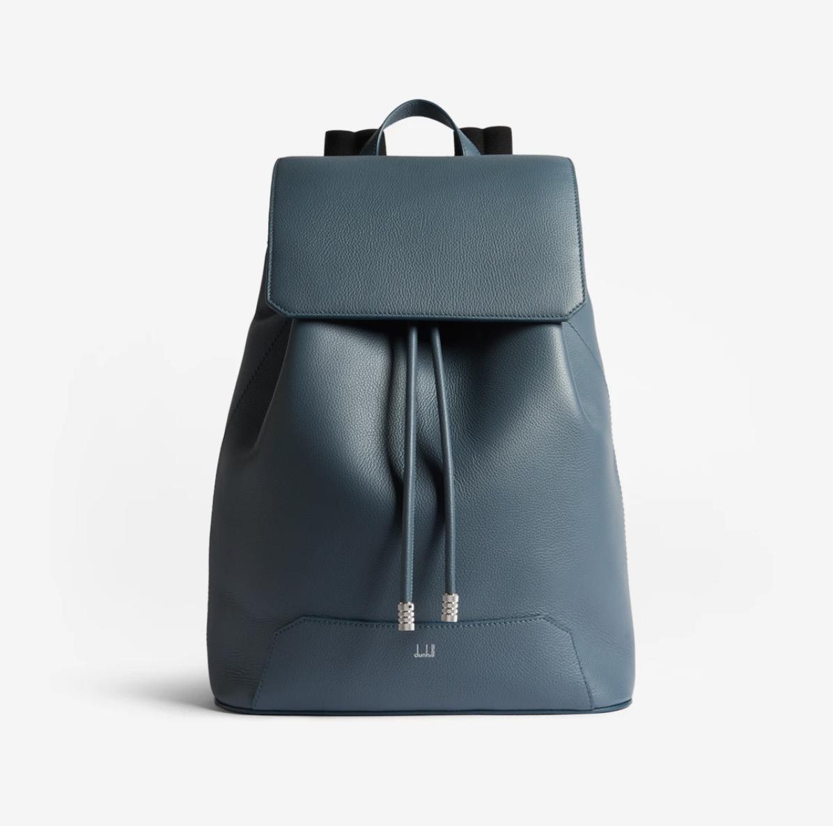 This backpack is engineered in cornflower blue leather with a cotton-blend rear panel, perfect for dad's next work trip. The top features a magnetic flap closure with a drawcord adjuster for additional control. There is also a zipped pocket at the side for easy access when on the move, and an extra zipped pocket inside the main compartment. Available for purchase at Hudson Yards store or online.